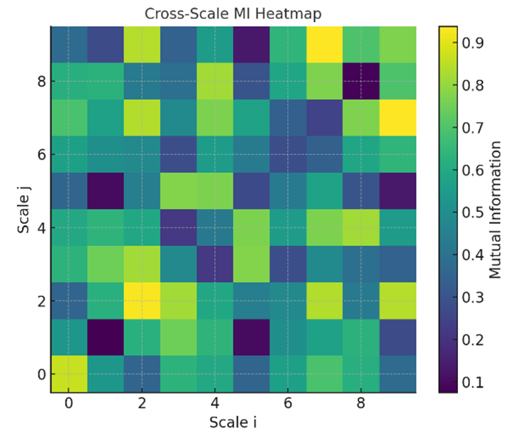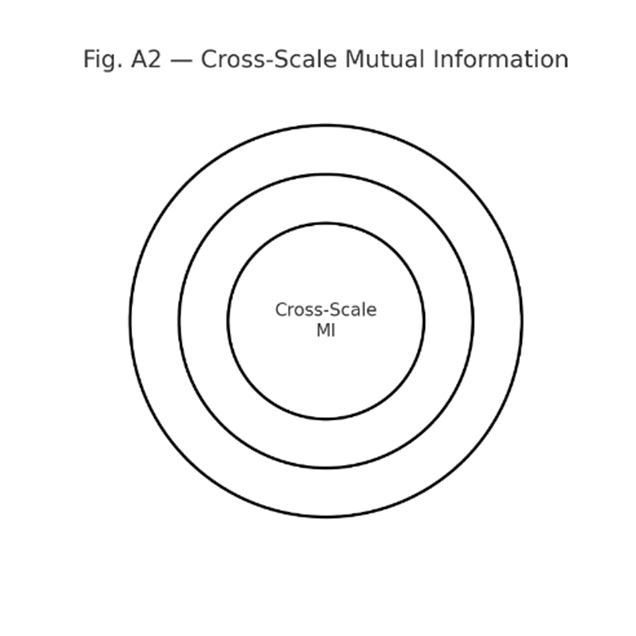 Here, local states X_s at different scales are compared. Adapted to represent Holographic Containment (H) by treating elevated cross-scale information as a proxy for holistic encoding. Testable through empirical cross-scale datasets (see Fig. A2 for nested scale network diagram).