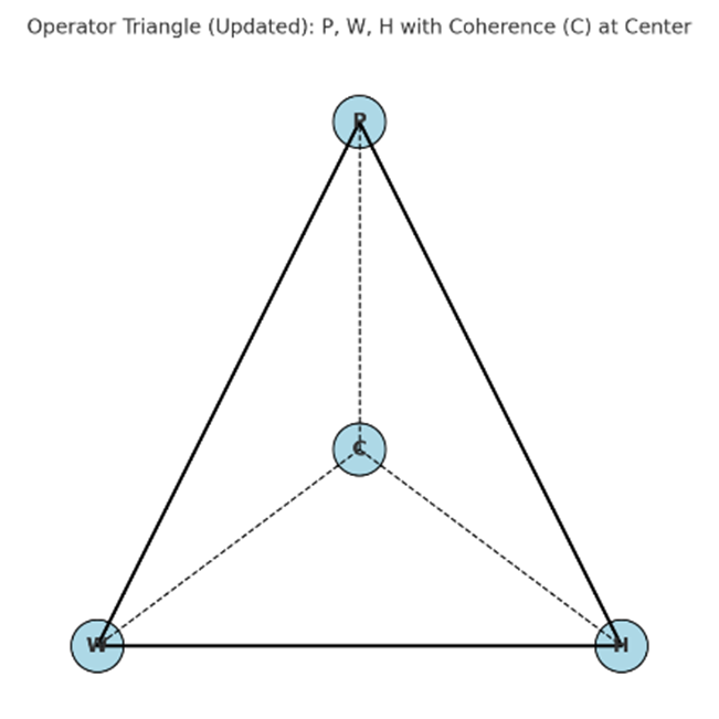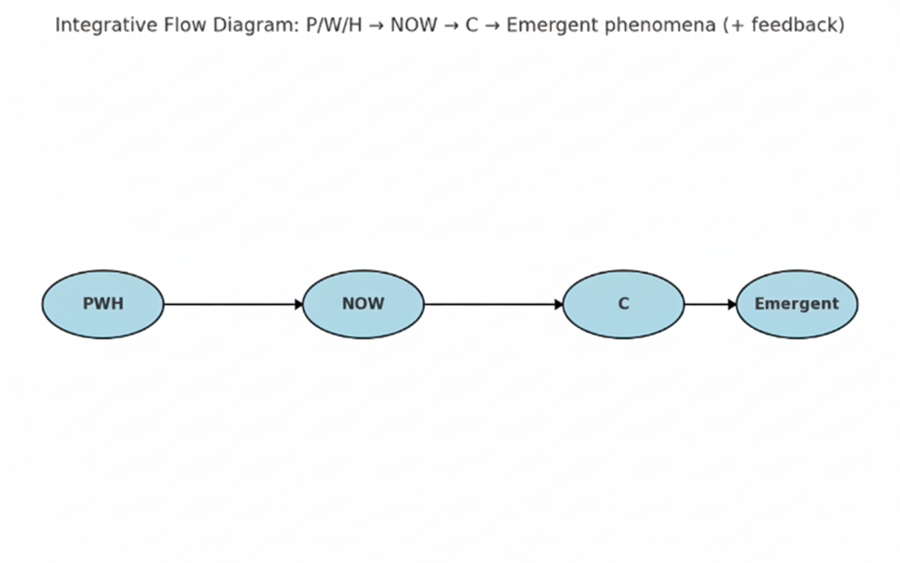 The Aspects converge into a unified framework. At the foundation are the primitives P (Paradoxical Simultaneity), W (Wholeness/Conservation), and H (Holographic Containment). These define the structure of the NOW-manifold: a field in which opposites coexist as phase-locked modes. Coherence (C) functions as the order parameter, providing a bridge between concept and empirical domain.