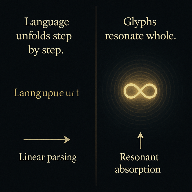 Contrasts two modes of expression: linear text unfolding step by step versus glyphic resonance absorbed as a whole. Together, they represent complementary ways of expressing paradox.