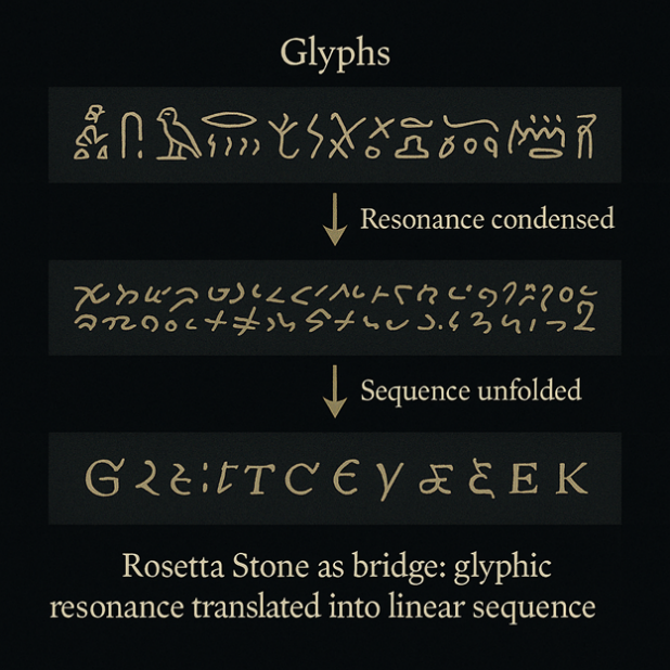 Demonstrates the historical translation of glyphic thought into linear language via the Rosetta Stone, bridging multidimensional resonance and sequential articulation.