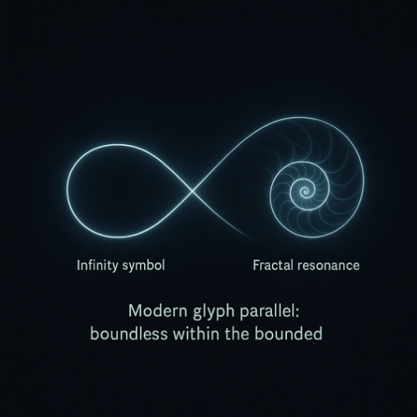 Unites the infinity symbol with a fractal spiral, illustrating how modern glyphs condense boundlessness and self-similarity into a single resonant form.