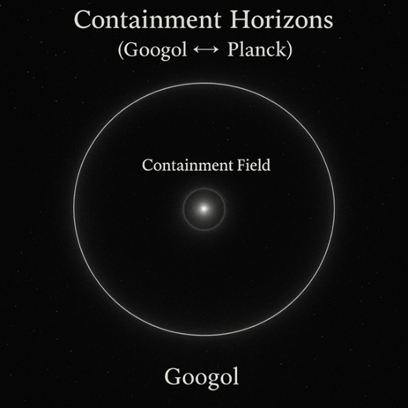 Shows the paradox of scale: Googol as the unreachable outer horizon pointing toward infinity, Planck as the inner horizon of agency and choice, with the containment field spanning between.