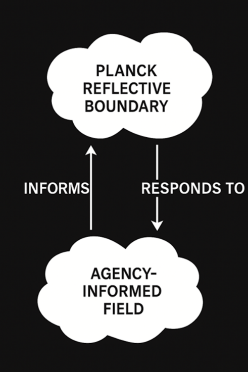 The figure above: Depicts how the Agency Informed Field informs the Planck Reflective Boundary, which responds back in turn, establishing a feedback loop of resonance. The bottom sequence illustrates the dynamics: Stasis (total potential) transitions through Planck perturbation into reflective response. This captures the mirror principle not as a static grid, but as an active process by which agency is sustained across boundaries.